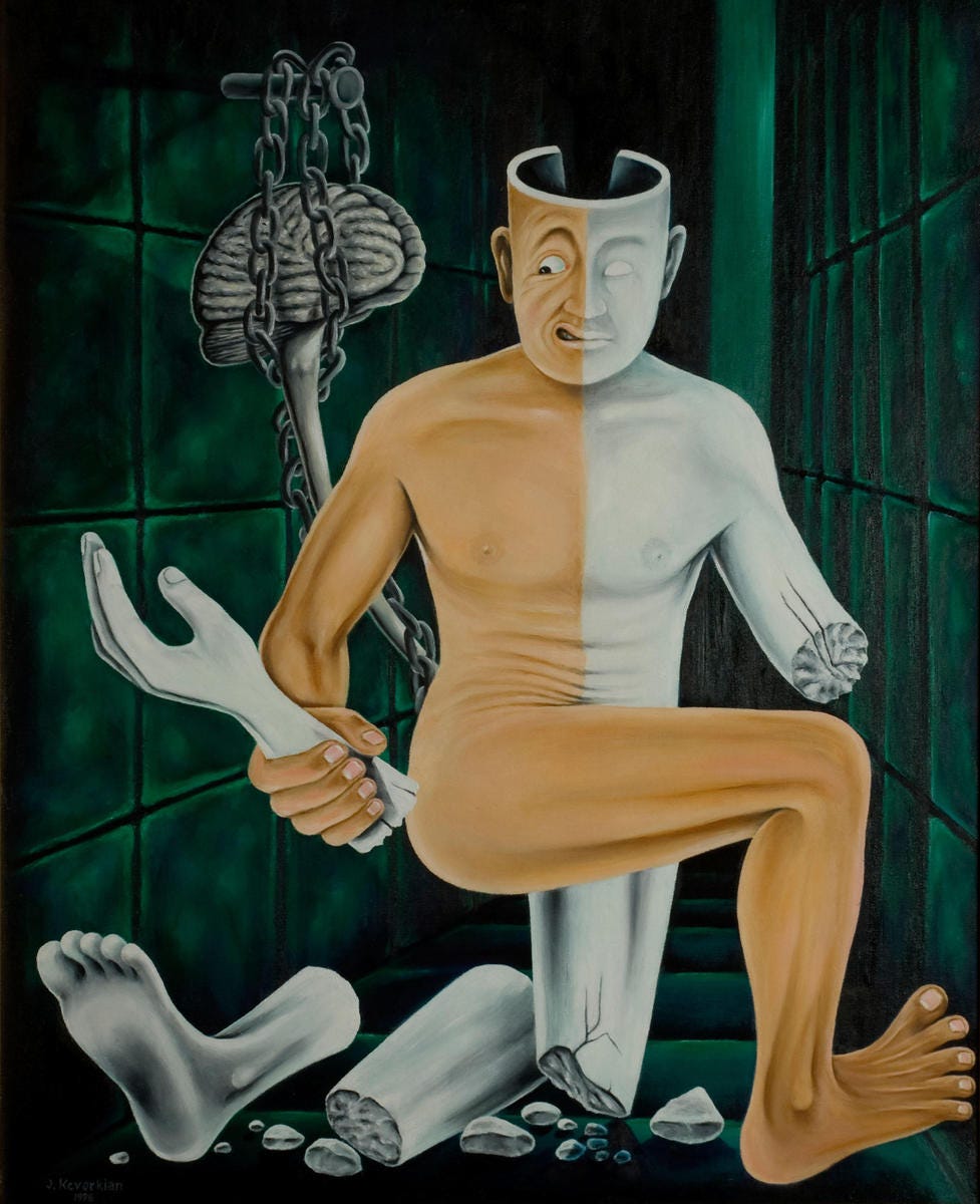 In 2012, I wrote an essay for Bidoun that reflected on how a child of the Armenian genocide became “Dr. Death,” the patron saint of euthanasia. It was prompted by an exhibition at the Armenian Library and Museum of America in Watertown, MA, of Kevorkian’s macabre paintings, usually well-hidden from public view. They are full of horrors: a man falls, screaming through a void, dragging his fingernails to the bone; another is feasting on himself. A greenish corpse ornamented with tinsel stands in agony, a human Christmas tree.