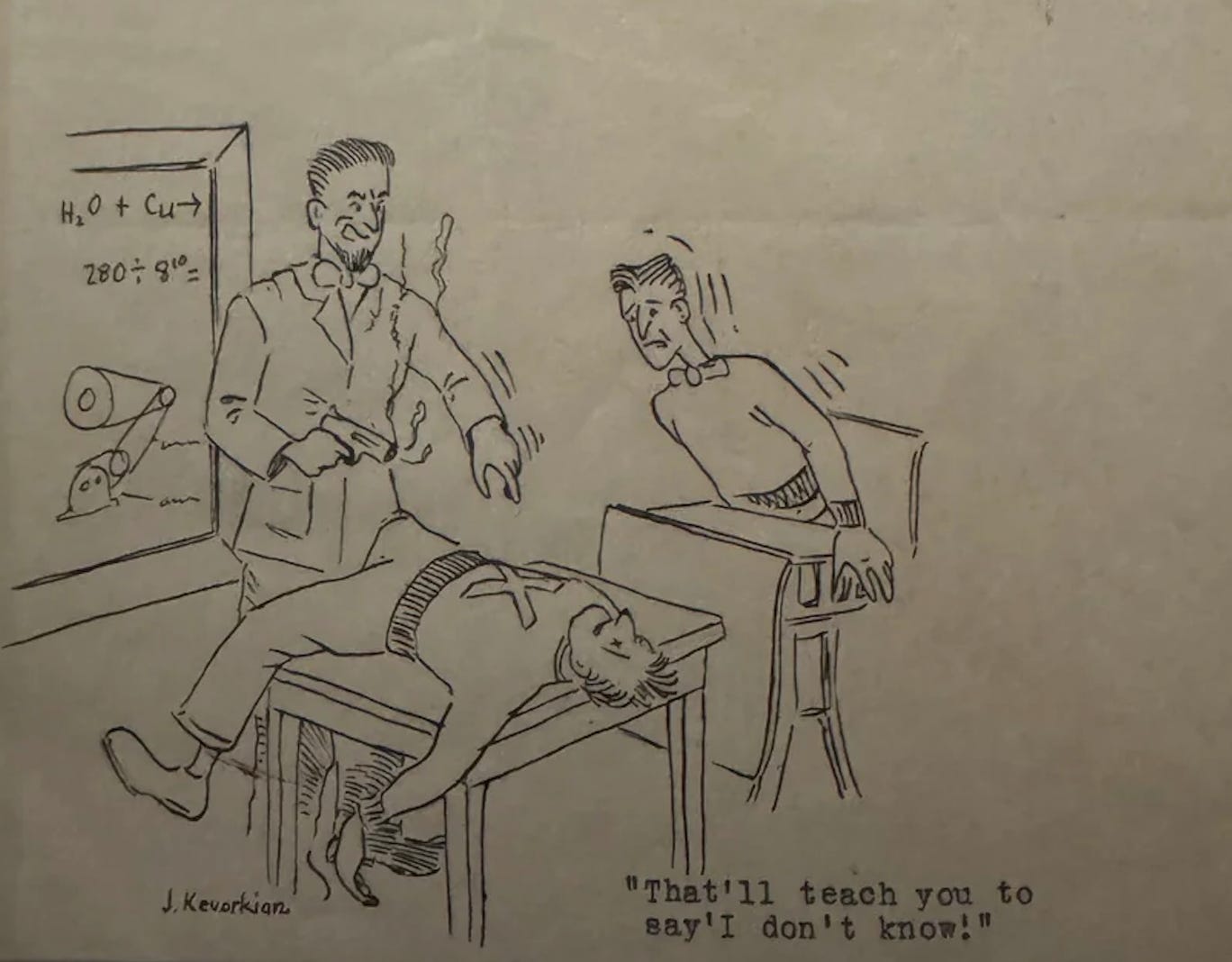 Many of the sixteen paintings in the exhibition were Kevorkian’s own feverishly repainted copies of originals that were, I wrote, “lost by a moving company when Kevorkian moved to California in 1976” to direct a Hollywood film of Handel’s Messiah. The Reddit revelation offers a coda to that story, the Chilean trove being, effectively, the archive of Kevorkian’s life, from his birth in Michigan in 1928 to 1983. It includes his childhood report cards, school essays, and diplomas; sketches and comics; bank statements and cheques; journal entries composed in various shapes: a crucifix, a labyrinth, a soldier’s silhouette, and his initials, J K. There are photos of dead bodies, letters to art collectors, music scores, and the lost reels of his failed Messiah. It seems likely that, rather than being lost in transit, Kevorkian’s possessions were sold at auction when he fell behind on payments for his storage unit after going bankrupt making the film.